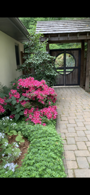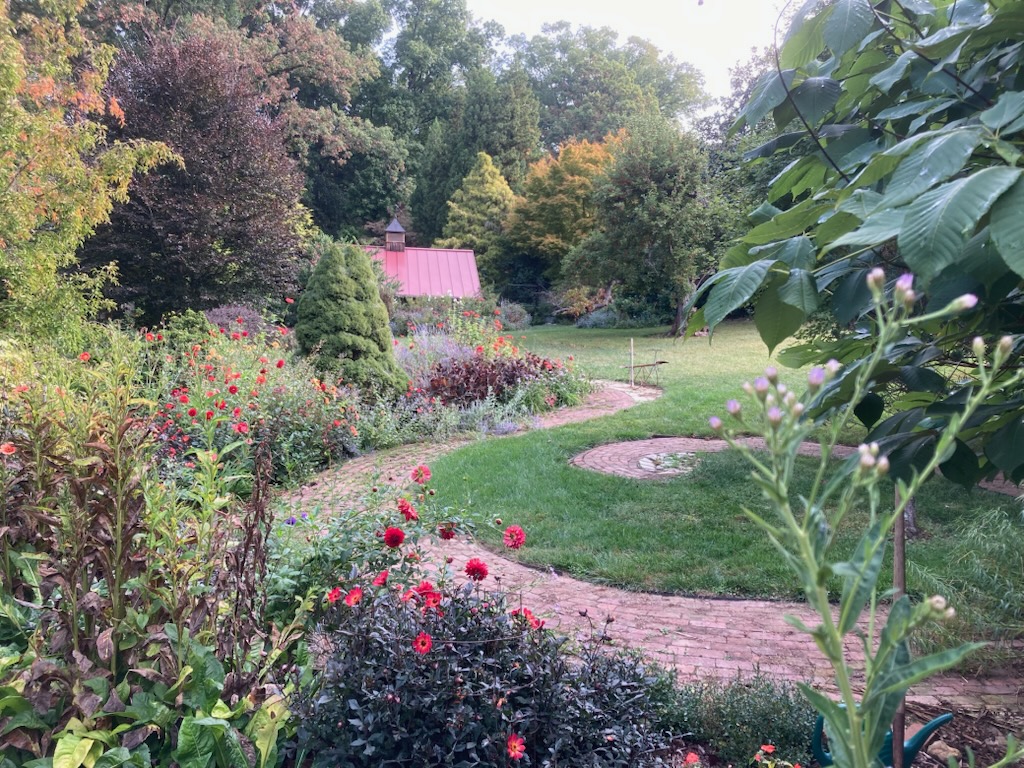 Landscaper Bill Duncan created his own garden at 19 Owl’s Nest Road, on partly wooded land that was in his family for generations. Ornamental trees and shrubs (many uncommon), along with original oak, beech and tulip poplar, provide the bones of this mature garden. Hardscaping and water features abound. The property was divided in three pieces and four years ago Meg Spurlin acquired the 2.5-acre portion remaining at number 19, containing the core of the garden and its many delightful “rooms”, terraces and seating areas . She has created several large flower borders, one following the brick serpentine path that winds through the open part of the garden.